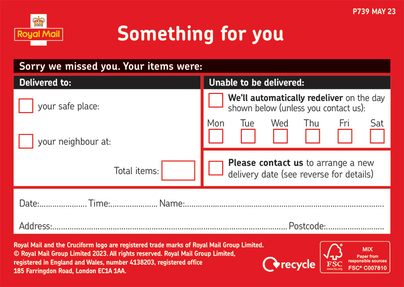 If Royal Mail is unable to successfully deliver your parcel to the address, a 'something for you' red card will be left to inform you of the attempted delivery. They may attempt delivery with one of your neighbours or leave in a safe place if this is enabled on your account. If Royal Mail left a red ‘Something for you’ card, the easiest way to get your mail to you is to arrange a Redelivery online here.